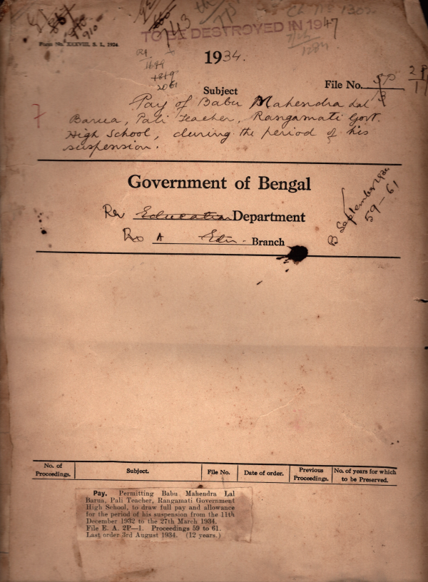 ermitting Babu Mahendra lal Barua Pali Teacher Rangamati Government High School to draw full pay and allowance for the period of his suspension from the 11th December 1932 to the 27the March, 1934