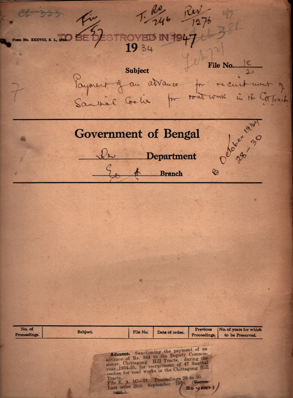 Payment of an advance for recruitment of santhal coolies for road works in the Chittagong Hill Tracts.