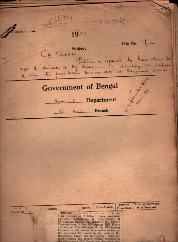 Petition of appeal by Uma Charan Kar aqut the decision of Deputy Commissioner, directing the Petitioner to Close his Pawn-broking vacating shop at Rangamati Bazar.
