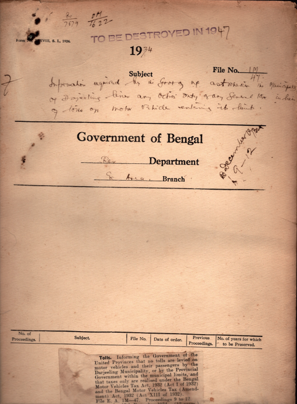 Informing the Government of the United Provinces that no tolls are levied on motor vehicles and their passengers by the Darjeeling Municipality or by the Provincial Government with in the Municipal limits, and that taxes only are realized under the Bengal Motor vehicles Tax Act, 1932 (Act 1 of 1932) and the Bengal Motor Vehicles Tax (Amendment) Act 1932 (Act XIII of 1932).