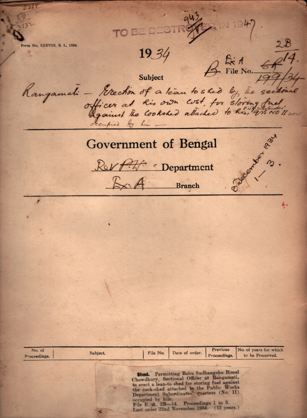 Permitting Babu Sudhangahu Bimal Chowdhury, Sectional officer at Rangamati to react a loan to shed for storing fuel against the cook shed attached to the Public Works Department Subordinate quarters (No.11) occupied by him.