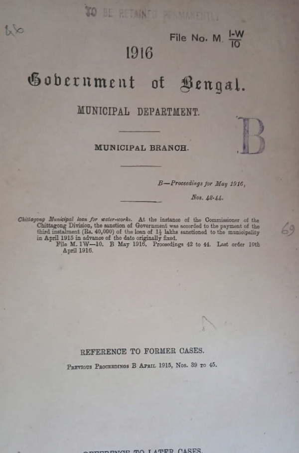 | Rack No. 12, Bundle No. 01 Sl No. 66 Principal to be followed in making nominations for appointments of Municipal commissioners belonging to different communities. | Rack No. 12, Bundle No. 01 Sl No. 67 Election of Chairman and Vice-Chairman, Baidyabati Municipality. | Rack No. 12, Bundle No. 01 Sl No. 68 Declaration of Beadon Street as a main thoroughfare under Act III (B.C.) of 1907. | Rack No. 12, Bundle No. 01 Sl No. 69 Chittagong Municipal loan for water works. | Rack No. 12, Bundle No. 01 Sl No. 70 Water Supply Scheme of the Pabna Municipality. | Rack No. 12, Bundle No. 01 Sl No. 71 Water Supply Scheme of the Chandpur Municipality. | Rack No. 12, Bundle No. 01 Sl No. 72 Grant of a Subsidy to the Dacca Municipality for expenditure on Conservancy. |