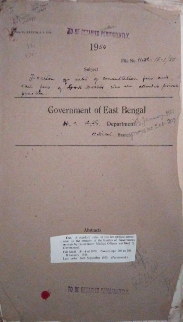 | Rack No. 09, Bundle No. 105, SI No. 8488 East Bengal Legislative Assembly Procedure Rules. | Rack No. 09, Bundle No. 105, SI No. 8489 Exchange rate of Malayan Dollers. | Rack No. 09, Bundle No. 105, SI No. 8490 Printing the non-standard forum issued voucher for the District Reserve store, Comilla. | Rack No. 09, Bundle No. 105, SI No. 8491 Fixation of rates of Consultation fees and other fees of govt. servants by govt. Medical officers. | Rack No. 09, Bundle No. 105, SI No. 8492 Proposal for increasing the pay and allowances of Mrs. D. Slave matrum, Civil Hospital, Sylhet. | Rack No. 09, Bundle No. 105, SI No. 8493 Fixation of rates of diets for patient's different ward of the staff Hospital in East Bengal. | Rack No. 09, Bundle No. 105, SI No. 8494 P.F. & gratuity money of Sri Surendra Nath, Ex-Permanent dresser of the Satkhira Sub-Divisional Hospital. |