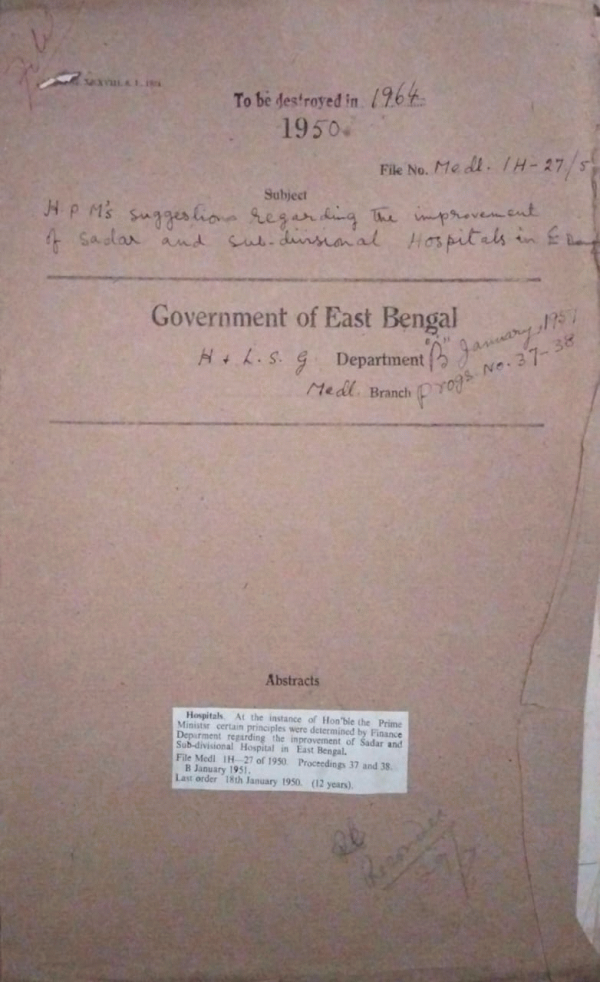 | Rack No. 09, Bundle No. 105, SI No. 8495 Exemption of Dr. Md. Faique Khan from attending the post graduate course training. | Rack No. 09, Bundle No. 105, SI No. 8496 Payment of Municipal tax for the office of the Civil Surgeon, Faridpur. | Rack No. 09, Bundle No. 105, SI No. 8497 Indian Medical Officers in Civil employ Annual confidential Reports Procedure for Submission. | Rack No. 09, Bundle No. 105, SI No. 8498 H.P.M.'s Suggestion regarding the improvement of Sadar and Sub-divisional Hospital, East Bengal. | Rack No. 09, Bundle No. 105, SI No. 8499 Requirement of furniture for the office of the central Medical Stores, Tajgoan. | Rack No. 09, Bundle No. 105, SI No. 8500 Appointment of Central Medical Store, Tejgaon. | Rack No. 09, Bundle No. 105, SI No. 8501 Proposal for allowing Babu Bhabatosh Kr. Mitra of the Dacca Medical School. |