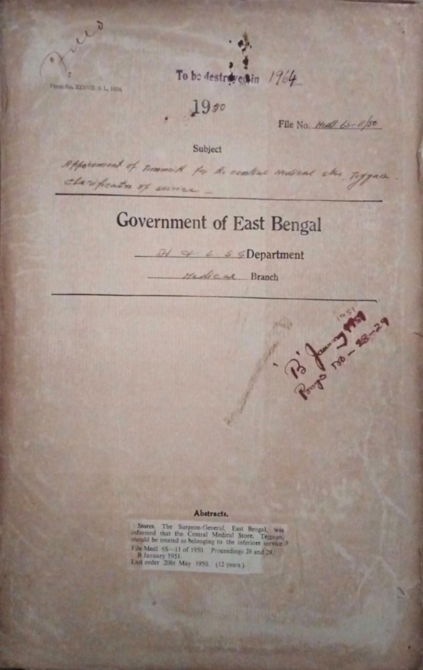 | Rack No. 09, Bundle No. 105, SI No. 8499 Requirement of furniture for the office of the central Medical Stores, Tajgoan. | Rack No. 09, Bundle No. 105, SI No. 8500 Appointment of Central Medical Store, Tejgaon. | Rack No. 09, Bundle No. 105, SI No. 8501 Proposal for allowing Babu Bhabatosh Kr. Mitra of the Dacca Medical School. | Rack No. 09, Bundle No. 105, SI No. 8502 Appointment of the Civil Surgeon, Sylhet. | Rack No. 09, Bundle No. 105, SI No. 8503 Constitution of the Managing Committee of the Rouzan State Orphanage. | Rack No. 09, Bundle No. 105, SI No. 8504 Appointment of travel Agent for arrangement of passage for central scholars sponsored by the Pakistan govt. | Rack No. 09, Bundle No. 105, SI No. 8505 Premature retirement of European officers of non-secretary of state's service. |