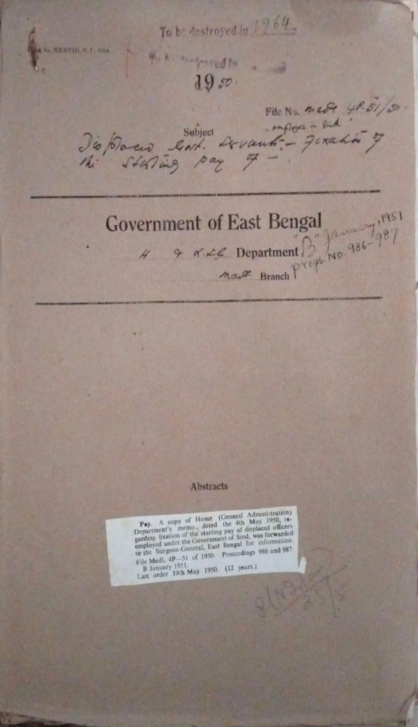 | Rack No. 09, Bundle No. 105, SI No. 8508 Repairs of the T.B. Segregation Hospital at Hemayetpur in District of Pabna. | Rack No. 09, Bundle No. 105, SI No. 8509 Facilities for training in compounding and Dispensing. | Rack No. 09, Bundle No. 105, SI No. 8510 Supply of information regarding fiscal matters to the Secretary general of the U.N. | Rack No. 09, Bundle No. 105, SI No. 8511 Displaced govt. servant's fixation of the Starting pay. | Rack No. 09, Bundle No. 105, SI No. 8512 Pay of Honorary paid Resident medical officer of the Mitford Hospital, Dacca. | Rack No. 09, Bundle No. 105, SI No. 8513 Instruction for preparing T.A. Bills. | Rack No. 09, Bundle No. 105, SI No. 8514 Representation from Hazi F. Ali for establishment of a Dispensary, Sylhet. |