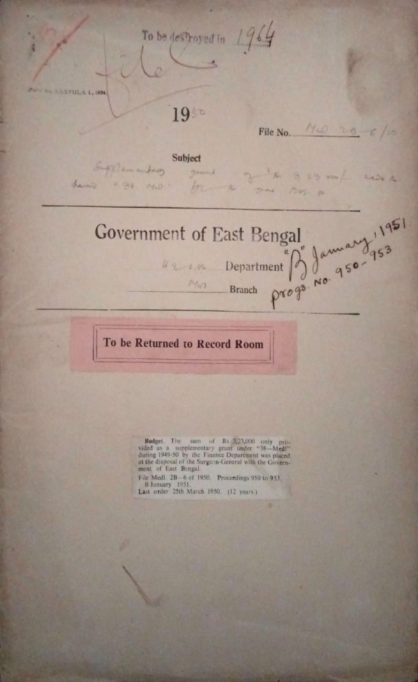 | Rack No. 09, Bundle No. 105, SI No. 8512 Pay of Honorary paid Resident medical officer of the Mitford Hospital, Dacca. | Rack No. 09, Bundle No. 105, SI No. 8513 Instruction for preparing T.A. Bills. | Rack No. 09, Bundle No. 105, SI No. 8514 Representation from Hazi F. Ali for establishment of a Dispensary, Sylhet. | Rack No. 09, Bundle No. 105, SI No. 8515 Supplementary grant of Rs. 3,23, 000/- to the year 1945-50. | Rack No. 09, Bundle No. 105, SI No. 8516 Annual govt. grant & subvention to the local Bds. of Sylhet. | Rack No. 09, Bundle No. 105, SI No. 8517 Sanction for repainting the platform of the tube-well of Pangsha outdoor dispensary. | Rack No. 09, Bundle No. 105, SI No. 8518 Provincial station of Health & Medical Service in the District of Chittagong. |