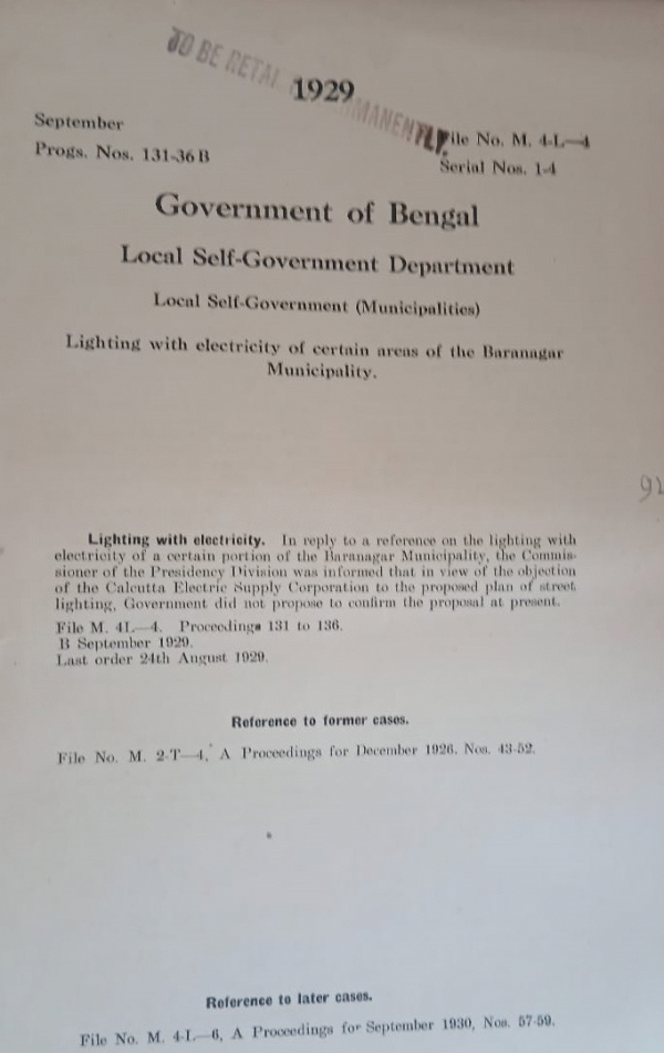 | Rack No. 12, Bundle No. 01 Sl No. 89 Election of Alderman, Calcutta Corporation. | Rack No. 12, Bundle No. 01 Sl No. 90 L.A. by Barisal Municipality for extension of trenching ground. | Rack No. 12, Bundle No. 01 Sl No. 91 Removal of inaccuracies in the Statement of boundaries of Certain Municipalities in the 24 Parganas District. | Rack No. 12, Bundle No. 01 Sl No. 92 Lighting with electricity of Certain areas of the Baranagar Municipality. | Rack No. 12, Bundle No. 01 Sl No. 93 Adoption of the model by-laws for the control of dangerous diseases by the Tamluk Municipality. | Rack No. 12, Bundle No. 01 Sl No. 96 Calcutta Municipal (Amendment) Act, 1933. | Rack No. 12, Bundle No. 02 Sl No. 100 Chittagong Municipality First Election under the New Act. |