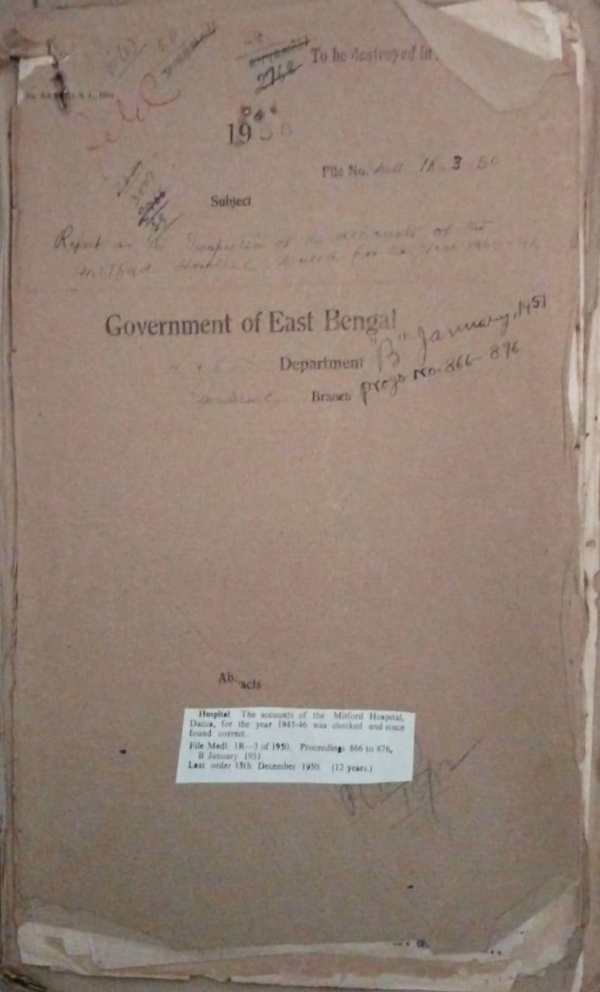 | Rack No. 09, Bundle No. 105, SI No. 8516 Annual govt. grant & subvention to the local Bds. of Sylhet. | Rack No. 09, Bundle No. 105, SI No. 8517 Sanction for repainting the platform of the tube-well of Pangsha outdoor dispensary. | Rack No. 09, Bundle No. 105, SI No. 8518 Provincial station of Health & Medical Service in the District of Chittagong. | Rack No. 09, Bundle No. 105, SI No. 8519 Report on the Inspection of the accounts of the Mitford Hospital, Dacca. | Rack No. 09, Bundle No. 105, SI No. 8520 Revision of the rules 2(6) of the prospectus of Dacca Medical College. | Rack No. 09, Bundle No. 105, SI No. 8521 Extra remuneration of Mvi. Rafique, Compounder, Firm dispensary, Manipur. | Rack No. 09, Bundle No. 105, SI No. 8522 Appointment of Sponsered overseas scholars on returns to Pakistan. |