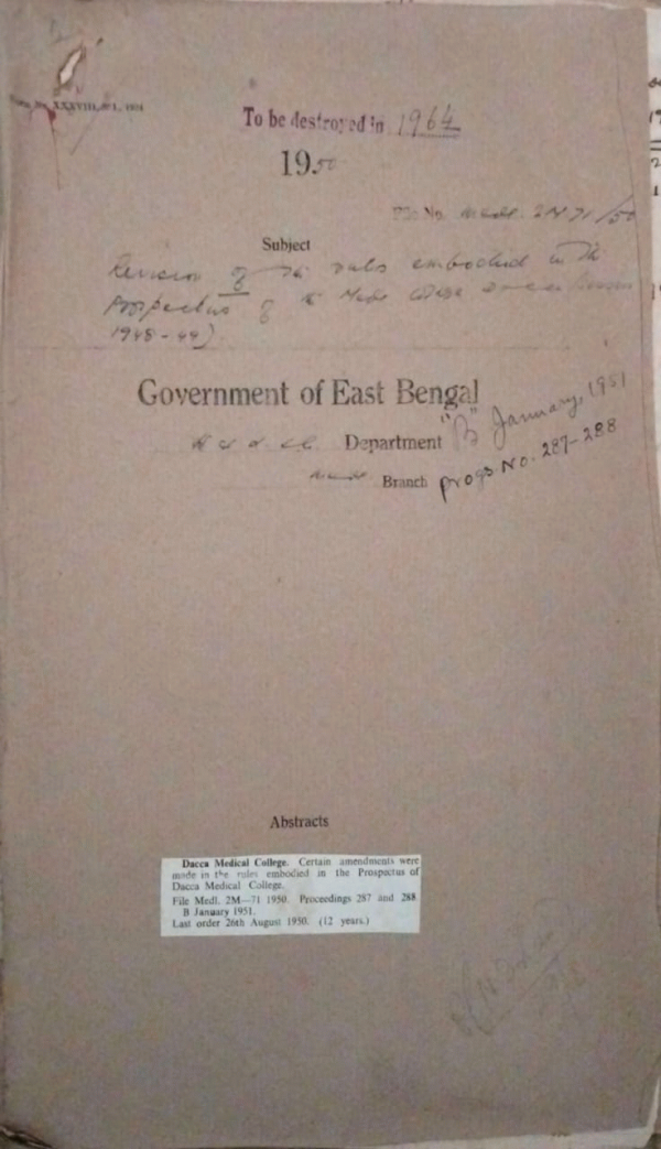 | Rack No. 09, Bundle No. 105, SI No. 8517 Sanction for repainting the platform of the tube-well of Pangsha outdoor dispensary. | Rack No. 09, Bundle No. 105, SI No. 8518 Provincial station of Health & Medical Service in the District of Chittagong. | Rack No. 09, Bundle No. 105, SI No. 8519 Report on the Inspection of the accounts of the Mitford Hospital, Dacca. | Rack No. 09, Bundle No. 105, SI No. 8520 Revision of the rules 2(6) of the prospectus of Dacca Medical College. | Rack No. 09, Bundle No. 105, SI No. 8521 Extra remuneration of Mvi. Rafique, Compounder, Firm dispensary, Manipur. | Rack No. 09, Bundle No. 105, SI No. 8522 Appointment of Sponsered overseas scholars on returns to Pakistan. | Rack No. 09, Bundle No. 105, SI No. 8523 Second Annual conference of the Pakistan, Association to the Advancement of Science's invitation. |