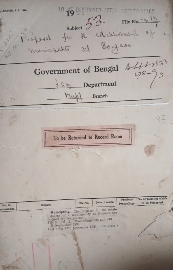 | Rack No. 12, Bundle No. 02 Sl No. 140 Supply of all general orders regarding transferred Subjects to the Revenue Department. | Rack No. 12, Bundle No. 02 Sl No. 94 Establishment of Municipality at Bongong. | Rack No. 12, Bundle No. 02 Sl No. 95 New Constitution of municipalities in the Rajshahi Division Dinajpur. | Rack No. 12, Bundle No. 02 Sl No. 97 Proposal for the establishment of a municipality at Bongaon. | Rack No. 12, Bundle No. 02 Sl No. 98 Position of the Nator Municipality owing to none of the municipal Commissioners having taken the Oath of allegiance. | Rack No. 12, Bundle No. 02 Sl No. 99 Adoption of rules 1 to 6 of the model rules, regarding fining by the Jessore municipality. | Rack No. 12, Bundle No. 03 Sl No. 141 C.Q. by Mr. Ananda Mohan Poddar regarding increasing the number of commissioners of the Narayanganj Municipality. |
