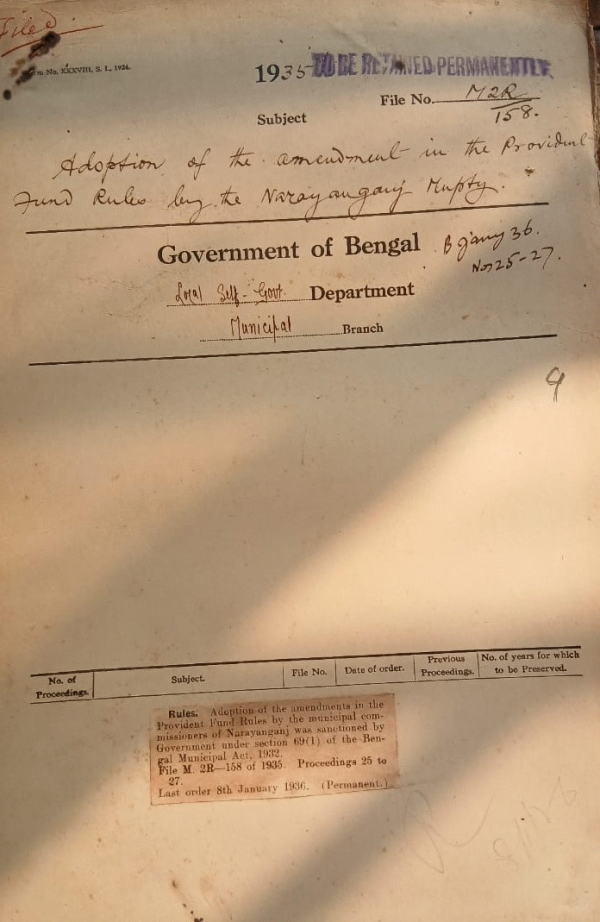 | Rack No. 12, Bundle No. 02 Sl No. 101 Permission to a govt. Servant to Stand for election to a Local Body. | Rack No. 12, Bundle No. 02 Sl No. 102 L.A. by the Khulna Municipality for the extension of the Mohamed an Burial ground from Tootpara. | Rack No. 12, Bundle No. 02 Sl No. 103 Howrah Municipal Audit Note for the year 1930-31. | Rack No. 12, Bundle No. 02 Sl No. 104 Adoption of the amendment in the P.F. Rules by the Narayanganj Municipality. | Rack No. 12, Bundle No. 02 Sl No. 105 L.A. by the Calcutta Improvement Trust for alignment No. XXXI. | Rack No. 12, Bundle No. 02 Sl No. 106 Adoption of the model rules regarding leave fines etc. of Municipal officers and Servants by the Pabna Municipality. | Rack No. 12, Bundle No. 02 Sl No. 107 Fees for Priest and domes attached to Burning Ghats, Bansberia municipality. |