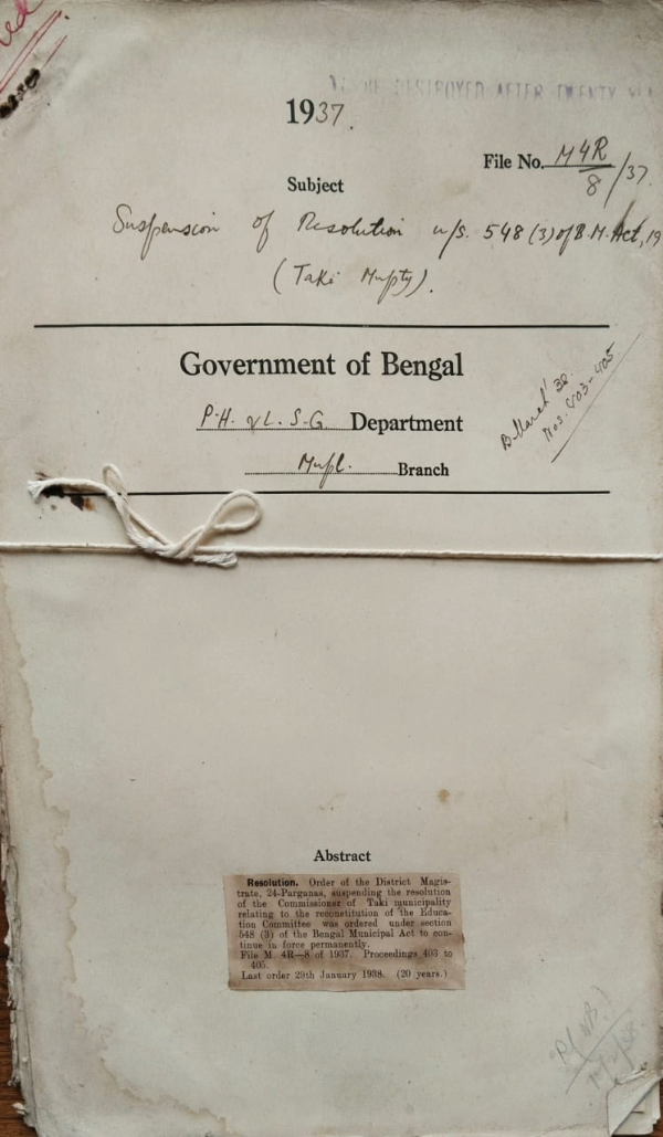 | Rack No. 12, Bundle No. 09 Sl No. 585 . Appointment of a Commissioner, Nabadwip Municipality | Rack No. 12, Bundle No. 09 Sl No. 585 Adoption of the model bye-laws regarding the conduct of business in places used for the purpose by the Tollyganj Municipality. | Rack No. 12, Bundle No. 11, Sl No. 701 Notes of Audit of the Accounts of the Hydro-Electric Fund, Darjeeling. | Rack No. 12, Bundle No. 11, Sl No. 702 Suspension of resolution u/s. 5548(3) of B.M. Act, 1932 (Taki Municipality). | Rack No. 12, Bundle No. 11, Sl No. 703 Proposed amendment of section 2 of the B.M. Act, 1932. | Rack No. 12, Bundle No. 11, Sl No. 704 Redistribution of wards and allocation of seats Chandpur Municipality. | Rack No. 12, Bundle No. 11, Sl No. 705 L.A. by the C.I. Trust for Scheme No. XLV Howrah Bridge Approach. |