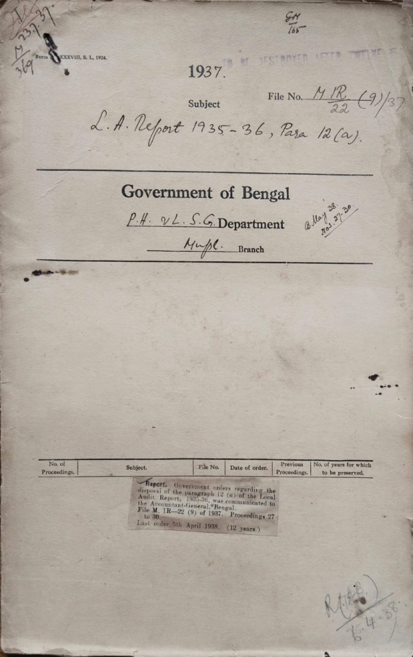 | Rack No. 12, Bundle No. 11, Sl No. 703 Proposed amendment of section 2 of the B.M. Act, 1932. | Rack No. 12, Bundle No. 11, Sl No. 704 Redistribution of wards and allocation of seats Chandpur Municipality. | Rack No. 12, Bundle No. 11, Sl No. 705 L.A. by the C.I. Trust for Scheme No. XLV Howrah Bridge Approach. | Rack No. 12, Bundle No. 11, Sl No. 706 L.A. report 1935-36, para 12(a). | Rack No. 12, Bundle No. 11, Sl No. 707 L.A. by the old Malda Municipality for filling up an insanitary ditch. | Rack No. 12, Bundle No. 11, Sl No. 708 L.A. by the Jessore Municipality for the construction of a new road joining Gahata+Lane with Strand road. | Rack No. 12, Bundle No. 11, Sl No. 709 Contribution of Rs. 2,749/4 by the Darjeeling Municipality for the maintenance of the Darjeeling Fire Brigade during 1936-37. |