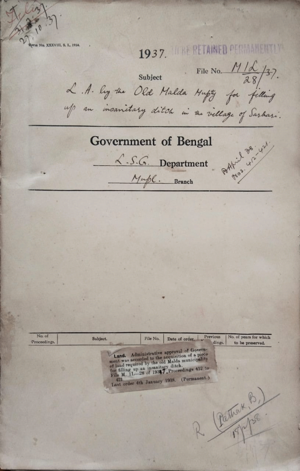 | Rack No. 12, Bundle No. 11, Sl No. 704 Redistribution of wards and allocation of seats Chandpur Municipality. | Rack No. 12, Bundle No. 11, Sl No. 705 L.A. by the C.I. Trust for Scheme No. XLV Howrah Bridge Approach. | Rack No. 12, Bundle No. 11, Sl No. 706 L.A. report 1935-36, para 12(a). | Rack No. 12, Bundle No. 11, Sl No. 707 L.A. by the old Malda Municipality for filling up an insanitary ditch. | Rack No. 12, Bundle No. 11, Sl No. 708 L.A. by the Jessore Municipality for the construction of a new road joining Gahata+Lane with Strand road. | Rack No. 12, Bundle No. 11, Sl No. 709 Contribution of Rs. 2,749/4 by the Darjeeling Municipality for the maintenance of the Darjeeling Fire Brigade during 1936-37. | Rack No. 12, Bundle No. 11, Sl No. 710 Annual report on the working of local Audit Department for the year 1935-36. |