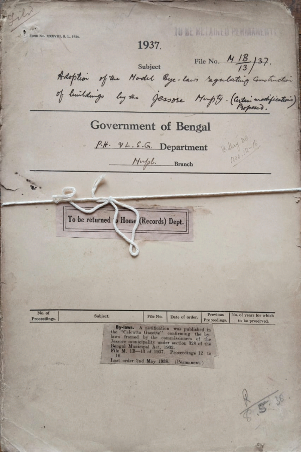 | Rack No. 12, Bundle No. 11, Sl No. 708 L.A. by the Jessore Municipality for the construction of a new road joining Gahata+Lane with Strand road. | Rack No. 12, Bundle No. 11, Sl No. 709 Contribution of Rs. 2,749/4 by the Darjeeling Municipality for the maintenance of the Darjeeling Fire Brigade during 1936-37. | Rack No. 12, Bundle No. 11, Sl No. 710 Annual report on the working of local Audit Department for the year 1935-36. | Rack No. 12, Bundle No. 11, Sl No. 711 Adoption of the model By-laws regulating construction of building by the Jessore Municipality. | Rack No. 12, Bundle No. 11, Sl No. 712 Adoption of a by-laws u/s. 245(a) and (b) regarding regulation of traffic by the Nabadwip Municipality. | Rack No. 12, Bundle No. 11, Sl No. 713 Extension of the term of commissioners Bogra Municipality. | Rack No. 12, Bundle No. 11, Sl No. 714 Regarding of the pay of B/Abhaya pada Mukerjee, the store Keeper of the Howrah Municipality. |