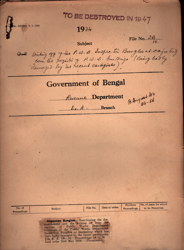 Sanctioning the dismantlement and the writing off from the register of Public Works Department buildings of the Public Works Department Inspection Bunglow at Darjeeling which has been badly damaged by the recent earthquake.