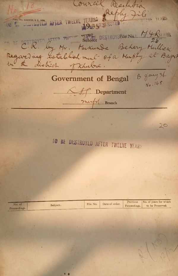 C.R. by Mr. Mukunda Behary Mullick regarding establishment of a Municipality at Bagerhat in the District of Khulna.