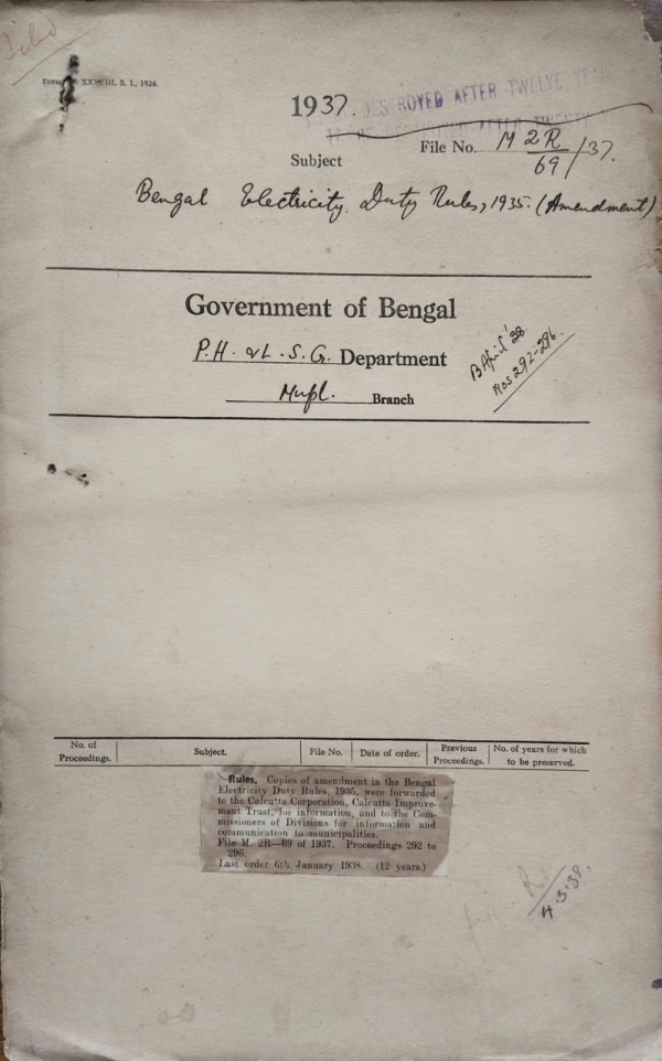 | Rack No. 12, Bundle No. 11, Sl No. 713 Extension of the term of commissioners Bogra Municipality. | Rack No. 12, Bundle No. 11, Sl No. 714 Regarding of the pay of B/Abhaya pada Mukerjee, the store Keeper of the Howrah Municipality. | Rack No. 12, Bundle No. 11, Sl No. 715 Inspection Note, Banseria Municipality. | Rack No. 12, Bundle No. 11, Sl No. 716 Bengal Electricity Duty Rules, 1935 (Amendment). | Rack No. 12, Bundle No. 11, Sl No. 717 Notes of the Audit of Accounts of the Serajgani Municipality for the year 1935-36. | Rack No. 12, Bundle No. 11, Sl No. 718 L.A. by Bankura Municipality for the extension of the Bankura market. | Rack No. 12, Bundle No. 11, Sl No. 719 Extension of the Provision of Section 424 of the B.M. Act to certain in the Murshidabad District. |