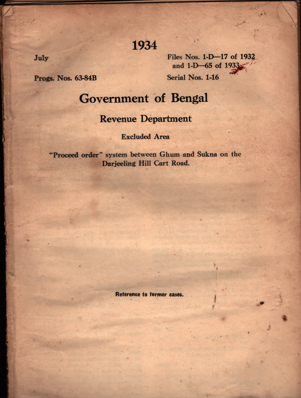 Government of Bengal Revenue Department, excluded area, "Proceed order" System between Chum and Sukna on the Darjeeling Hill Cart Road.