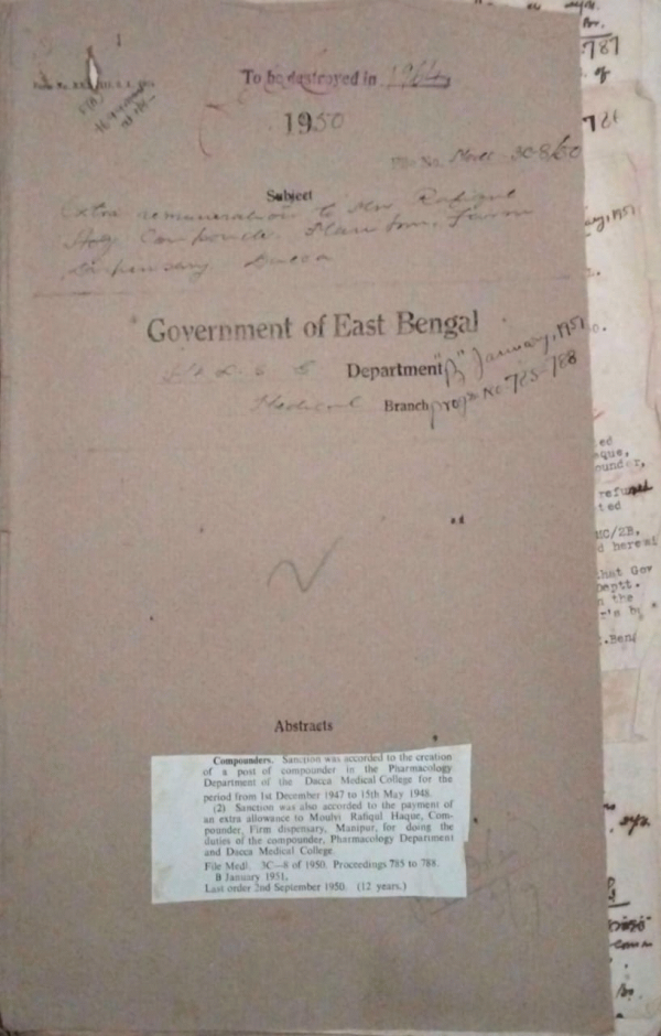 | Rack No. 09, Bundle No. 105, SI No. 8518 Provincial station of Health & Medical Service in the District of Chittagong. | Rack No. 09, Bundle No. 105, SI No. 8519 Report on the Inspection of the accounts of the Mitford Hospital, Dacca. | Rack No. 09, Bundle No. 105, SI No. 8520 Revision of the rules 2(6) of the prospectus of Dacca Medical College. | Rack No. 09, Bundle No. 105, SI No. 8521 Extra remuneration of Mvi. Rafique, Compounder, Firm dispensary, Manipur. | Rack No. 09, Bundle No. 105, SI No. 8522 Appointment of Sponsered overseas scholars on returns to Pakistan. | Rack No. 09, Bundle No. 105, SI No. 8523 Second Annual conference of the Pakistan, Association to the Advancement of Science's invitation. | Rack No. 09, Bundle No. 105, SI No. 8524 Payment of advertisement bill for 2 posts of technicians, Dacca Medical College. |
