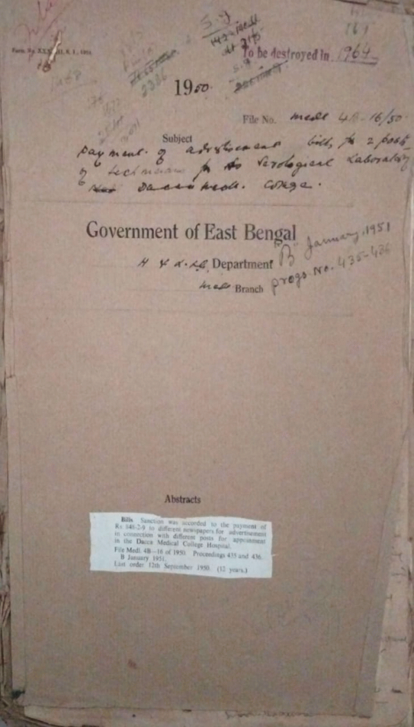 | Rack No. 09, Bundle No. 105, SI No. 8521 Extra remuneration of Mvi. Rafique, Compounder, Firm dispensary, Manipur. | Rack No. 09, Bundle No. 105, SI No. 8522 Appointment of Sponsered overseas scholars on returns to Pakistan. | Rack No. 09, Bundle No. 105, SI No. 8523 Second Annual conference of the Pakistan, Association to the Advancement of Science's invitation. | Rack No. 09, Bundle No. 105, SI No. 8524 Payment of advertisement bill for 2 posts of technicians, Dacca Medical College. | Rack No. 09, Bundle No. 105, SI No. 8525 T.A. of the thana M/O under the Dispensary Scheme. | Rack No. 09, Bundle No. 105, SI No. 8526 Midnapore Zemindary Co. Charitable dispensary at Bilmania. | Rack No. 09, Bundle No. 105, SI No. 8527 Provision of a menial for the dispensaries. |