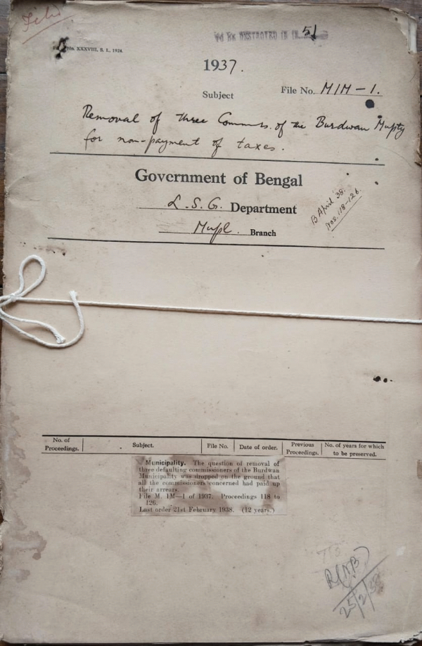 | Rack No. 12, Bundle No. 11, Sl No. 719 Extension of the Provision of Section 424 of the B.M. Act to certain in the Murshidabad District. | Rack No. 12, Bundle No. 11, Sl No. 720 C.Q. by Mr. B.C. Dutta M.L.C. regarding creation of an improvement Trust in Howrah. | Rack No. 12, Bundle No. 11, Sl No. 721 L.A. by the Bankura Municipality for the construction of a new road in the village of Demurari Gopinathpur. | Rack No. 12, Bundle No. 11, Sl No. 722 Removal of three commissioners of the Burdwan Municipality for non-payment of taxes. | Rack No. 12, Bundle No. 11, Sl No. 723 Statement of Receipt and expenditure under the Calcutta Hackney Carriage Act 1919 for the year 1936–37. | Rack No. 12, Bundle No. 11, Sl No. 724 Petition of M/Taru Mia for removal of the ban which debars him from being a commissioner of a municipality. | Rack No. 12, Bundle No. 11, Sl No. 725 Amendments to Fundamental rules u/s 24, of the Govt. of India Act, 1935. |