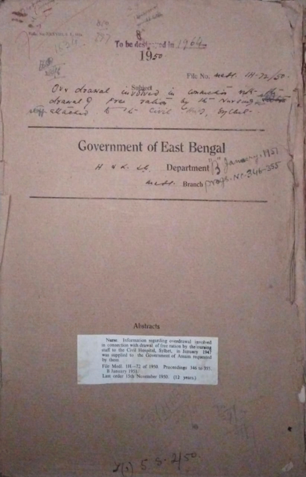 | Rack No. 09, Bundle No. 105, SI No. 8526 Midnapore Zemindary Co. Charitable dispensary at Bilmania. | Rack No. 09, Bundle No. 105, SI No. 8527 Provision of a menial for the dispensaries. | Rack No. 09, Bundle No. 105, SI No. 8528 Permission to Nil Ratan Roy 4th year Final Student, Dacca Medical School to apper at the Final Examination. | Rack No. 09, Bundle No. 105, SI No. 8529 Over drawal involved in connection with the drawal of free ration by the Nursing staff, Sylhet. | Rack No. 09, Bundle No. 105, SI No. 8530 Recruitment to 17 permanent posts in the Eastern Pakistan Medical Service. | Rack No. 09, Bundle No. 105, SI No. 8531 Proposal for the Change of the period of Pak Financial year. | Rack No. 09, Bundle No. 105, SI No. 8532 Sanction to the payment for purchase of Materials for the Medical College Hospital, Dacca. |