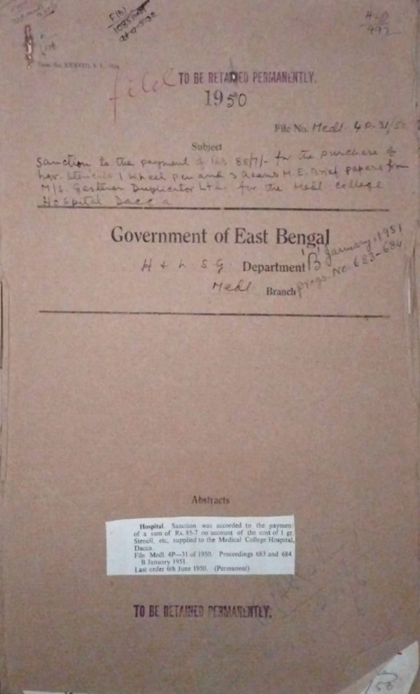 | Rack No. 09, Bundle No. 105, SI No. 8529 Over drawal involved in connection with the drawal of free ration by the Nursing staff, Sylhet. | Rack No. 09, Bundle No. 105, SI No. 8530 Recruitment to 17 permanent posts in the Eastern Pakistan Medical Service. | Rack No. 09, Bundle No. 105, SI No. 8531 Proposal for the Change of the period of Pak Financial year. | Rack No. 09, Bundle No. 105, SI No. 8532 Sanction to the payment for purchase of Materials for the Medical College Hospital, Dacca. | Rack No. 09, Bundle No. 105, SI No. 8533 Delivery of foreign consignments on behalf of govt. of East Bengal Authority. | Rack No. 09, Bundle No. 105, SI No. 8534 Report on the inspection of accounts of Famine and Dinajpur during the year 1946-47. | Rack No. 09, Bundle No. 105, SI No. 8535 Opening of new detailed head sale proceeds of movable assets of evacuees u/h. |