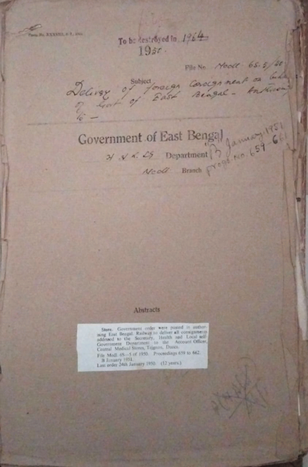 | Rack No. 09, Bundle No. 105, SI No. 8530 Recruitment to 17 permanent posts in the Eastern Pakistan Medical Service. | Rack No. 09, Bundle No. 105, SI No. 8531 Proposal for the Change of the period of Pak Financial year. | Rack No. 09, Bundle No. 105, SI No. 8532 Sanction to the payment for purchase of Materials for the Medical College Hospital, Dacca. | Rack No. 09, Bundle No. 105, SI No. 8533 Delivery of foreign consignments on behalf of govt. of East Bengal Authority. | Rack No. 09, Bundle No. 105, SI No. 8534 Report on the inspection of accounts of Famine and Dinajpur during the year 1946-47. | Rack No. 09, Bundle No. 105, SI No. 8535 Opening of new detailed head sale proceeds of movable assets of evacuees u/h. | Rack No. 09, Bundle No. 105, SI No. 8536 Non-availability of Cotton Wool in Pakistan. |