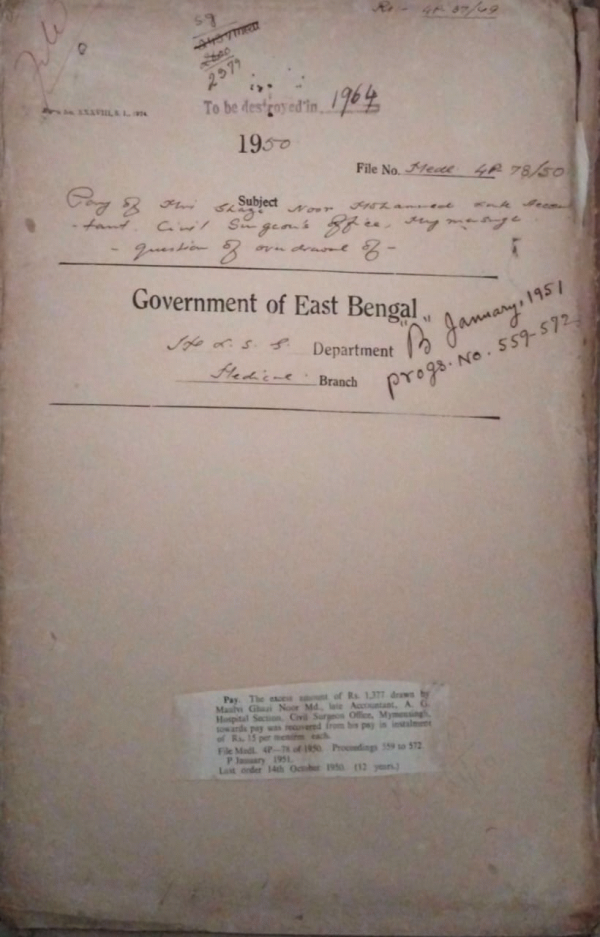 | Rack No. 09, Bundle No. 105, SI No. 8537 Supply of Medicine to the Mirzapur Kumudini welfare Hospital, Mymensingh. | Rack No. 09, Bundle No. 105, SI No. 8538 Question whether the central govt. employees are entitled to charge fees for medical attendance. | Rack No. 09, Bundle No. 105, SI No. 8539 Re-opening of a class for training of Midwives in the Mitford Hospital, Dacca. | Rack No. 09, Bundle No. 105, SI No. 8540 Pay of Mvi. Ghazi Noor Md. Late Accountant Civil Surgeons office, Mymensingh. | Rack No. 09, Bundle No. 105, SI No. 8541 Extension of Service of Babu Dr. Sandari Mohan Datta, M/O. Barahimpur, Sylhet. | Rack No. 09, Bundle No. 105, SI No. 8542 Revised Budget estimate for the year 1950-51. | Rack No. 09, Bundle No. 105, SI No. 8543 Provincial of Medical and Public Health Services in the district of Bogra. |