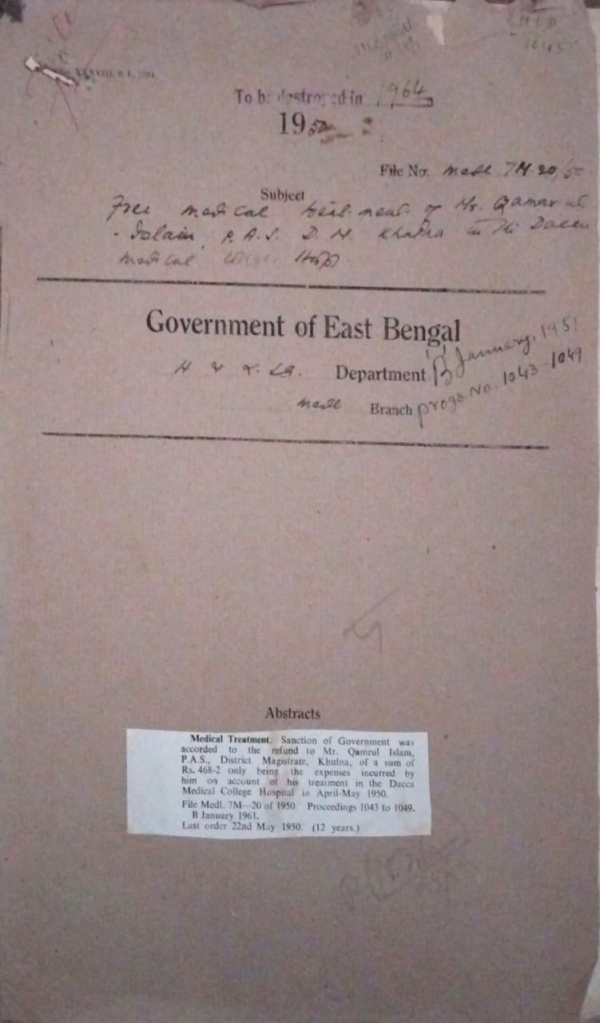 | Rack No. 09, Bundle No. 105, SI No. 8547 Sanction committee for admission of students into the Mymensingh Medical School, 1950-51. | Rack No. 09, Bundle No. 105, SI No. 8548 Materials for three years of Pakistan to be issued by the govt. of Pakistan. | Rack No. 09, Bundle No. 105, SI No. 8549 Payment of arrear bills (Repair Charges) X-ray inclines of the Medical College Hospital, Dacca. | Rack No. 09, Bundle No. 105, SI No. 8550 Free Medical treatment of Mr. Qamrul Islam, P.A.S., D. M. Khulna in the Dacca Medical College Hospital. | Rack No. 09, Bundle No. 106, Sl No. 5877 Sanction of Rs. 650/- for the purchase of stationery articles of the Dacca Medical College. | Rack No. 09, Bundle No. 106, Sl No. 5878 Procedure to information's to accrual govt. through | Rack no. 09, Bundle no. 106, Sl no. 8551 Dismasting the baffle walls of emergency Hospital Barisal administrative approval for. |
