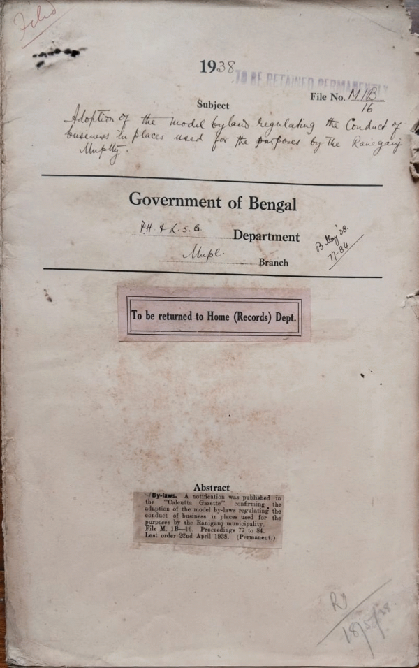 | Rack No. 12, Bundle No. 11, Sl No. 727 Election of a commissioner of the Muktagacha Municipality. | Rack No. 12, Bundle No. 11, Sl No. 728 Payment of a Special allowance to Mr. Niharch Deputy magistrate, Calcutta Improvement Trust. | Rack No. 12, Bundle No. 11, Sl No. 729 Amendments of the G.P. Fund (Bengal Service) rules. | Rack No. 12, Bundle No. 11, Sl No. 730 Adoption of the model bye-laws regulating the conduct of business in places used for the Purposes by the Ranjganj Municipality. | Rack No. 12, Bundle No. 11, Sl No. 731 Amendments to Fundamental rule 81. | Rack No. 12, Bundle No. 11, Sl No. 732 L.A. by the Santipur Municipality for a burial ground at Santipur. | Rack No. 12, Bundle No. 11, Sl No. 733 L.A. by the Dacca Municipality for the extension of municipal office compound. |