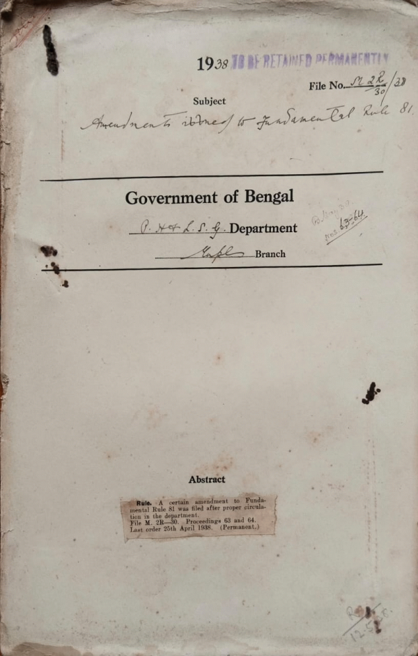 | Rack No. 12, Bundle No. 11, Sl No. 728 Payment of a Special allowance to Mr. Niharch Deputy magistrate, Calcutta Improvement Trust. | Rack No. 12, Bundle No. 11, Sl No. 729 Amendments of the G.P. Fund (Bengal Service) rules. | Rack No. 12, Bundle No. 11, Sl No. 730 Adoption of the model bye-laws regulating the conduct of business in places used for the Purposes by the Ranjganj Municipality. | Rack No. 12, Bundle No. 11, Sl No. 731 Amendments to Fundamental rule 81. | Rack No. 12, Bundle No. 11, Sl No. 732 L.A. by the Santipur Municipality for a burial ground at Santipur. | Rack No. 12, Bundle No. 11, Sl No. 733 L.A. by the Dacca Municipality for the extension of municipal office compound. | Rack No. 12, Bundle No. 11, Sl No. 734 Proposal extension of the municipal office Building at Howrah. |