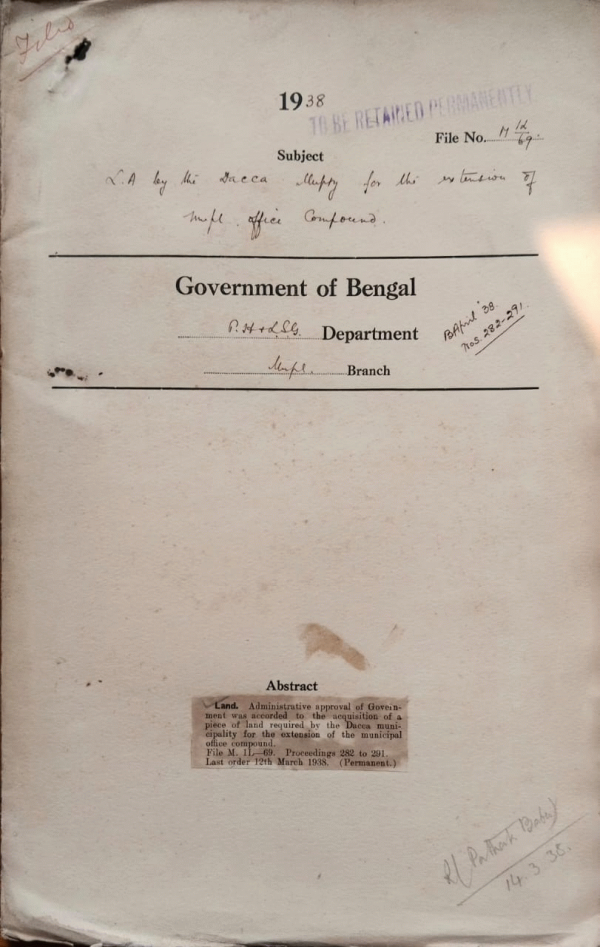 | Rack No. 12, Bundle No. 11, Sl No. 730 Adoption of the model bye-laws regulating the conduct of business in places used for the Purposes by the Ranjganj Municipality. | Rack No. 12, Bundle No. 11, Sl No. 731 Amendments to Fundamental rule 81. | Rack No. 12, Bundle No. 11, Sl No. 732 L.A. by the Santipur Municipality for a burial ground at Santipur. | Rack No. 12, Bundle No. 11, Sl No. 733 L.A. by the Dacca Municipality for the extension of municipal office compound. | Rack No. 12, Bundle No. 11, Sl No. 734 Proposal extension of the municipal office Building at Howrah. | Rack No. 12, Bundle No. 11, Sl No. 735 Financial powers of officers to sanction purchase of stores for the Public Service. | Rack No. 12, Bundle No. 11, Sl No. 736 Extension of Chapter X of B.M. Act, 1932 to the Baranagar Municipality. |