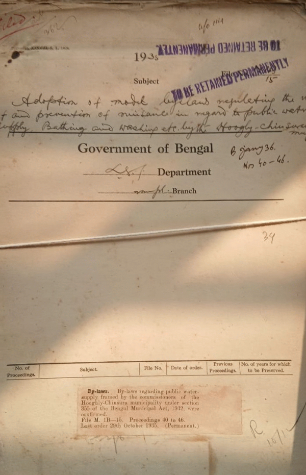 | Rack No. 12, Bundle No. 02 Sl No. 131 L. A.by the Calcutta Corporation for the extension of an arm of Gopal Chandra Lane. | Rack No. 12, Bundle No. 02 Sl No. 132 Adoption of the model by laws for the Prevention of the Spread of Anthrax by the Bally Municipality, | Rack No. 12, Bundle No. 02 Sl No. 133 Contribution of Rs. 100/- towards the Calcutta Medical College Centenary fund by the Bhatpara Municipality. | Rack No. 12, Bundle No. 02 Sl No. 134 Adoption of model by laws regulating the use of 1935 and prevention of the Public Water Supply Bathing by the Hooghly Chinsura Municipality. | Rack No. 12, Bundle No. 02 Sl No. 135 L.A. by the Calcutta Improvement Trust for Alignment No. XLI. | Rack No. 12, Bundle No. 02 Sl No. 136 Postal Endowment Assurance of Mangal Ram, attached L.S.G. Department. | Rack No. 12, Bundle No. 02 Sl No. 137 Petition from A.K. Siddique Ahmed delars removal of the law which delars him from obtaining employment under the Corporation of Calcutta. |