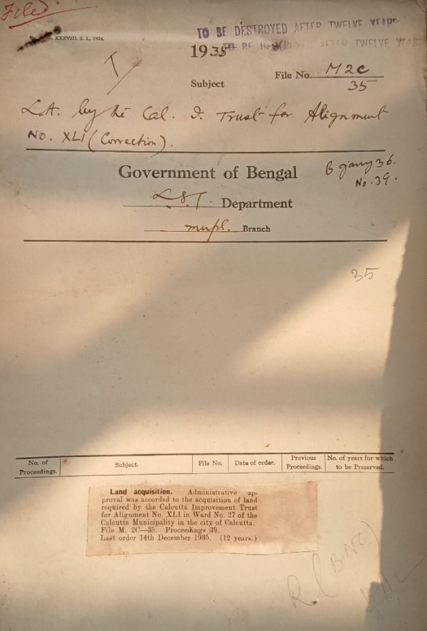 L.A. by the Calcutta Improvement Trust for Alignment No. XLI.
