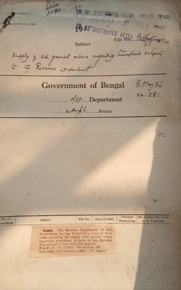 | Rack No. 12, Bundle No. 02 Sl No. 137 Petition from A.K. Siddique Ahmed delars removal of the law which delars him from obtaining employment under the Corporation of Calcutta. | Rack No. 12, Bundle No. 02 Sl No. 138 Adoption of rule 8 A. to the P.F. Rules by Dacca Municipality. | Rack No. 12, Bundle No. 02 Sl No. 139 Grant of Rs. 1137/- from the Motor Vehicles Tax for the Construction of a Motor Bus Stand within the Budge Budge Municipality | Rack No. 12, Bundle No. 02 Sl No. 140 Supply of all general orders regarding transferred Subjects to the Revenue Department. | Rack No. 12, Bundle No. 02 Sl No. 94 Establishment of Municipality at Bongong. | Rack No. 12, Bundle No. 02 Sl No. 95 New Constitution of municipalities in the Rajshahi Division Dinajpur. | Rack No. 12, Bundle No. 02 Sl No. 97 Proposal for the establishment of a municipality at Bongaon. |