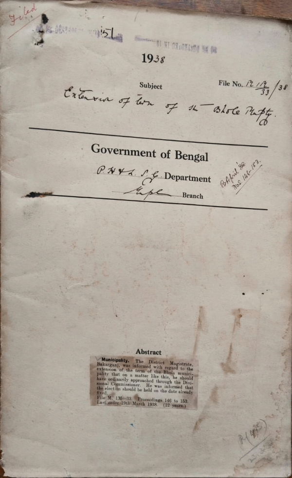 | Rack No. 12, Bundle No. 11, Sl No. 736 Extension of Chapter X of B.M. Act, 1932 to the Baranagar Municipality. | Rack No. 12, Bundle No. 11, Sl No. 737 L.A. by Calcutta Improvement trust for scheme No. III Maniktola. | Rack No. 12, Bundle No. 11, Sl No. 738 Adoption of model by-laws regulating the erection of masonry buildings by the Tollyganj Municipality. | Rack No. 12, Bundle No. 11, Sl No. 739 Extension of term of the Bhola Municipality. | Rack No. 12, Bundle No. 11, Sl No. 740 Chairman of the Dinajpur Municipality was informed that it was not possible to redistribute the reserved seats. | Rack No. 12, Bundle No. 11, Sl No. 741 Proposed amendment of Rule 28 of Election Rule to the Darjeeling Municipality. | Rack No. 12, Bundle No. 11, Sl No. 742 Grant of an allowance of Rs. 100/- per mensem by Cal. Corporation to Dr. L.M. Biswas, their Health officer for the control of Motor Ambulance Services. |