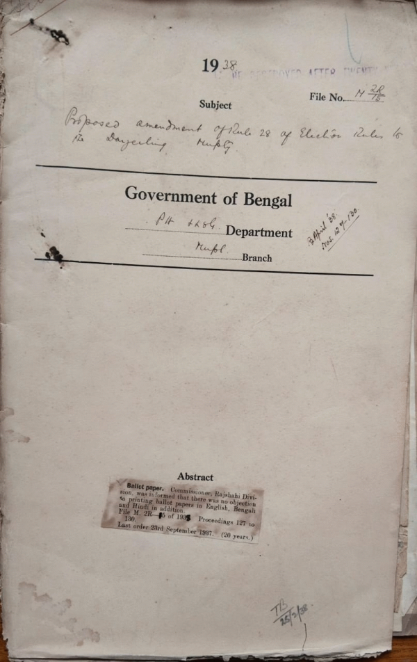 | Rack No. 12, Bundle No. 11, Sl No. 738 Adoption of model by-laws regulating the erection of masonry buildings by the Tollyganj Municipality. | Rack No. 12, Bundle No. 11, Sl No. 739 Extension of term of the Bhola Municipality. | Rack No. 12, Bundle No. 11, Sl No. 740 Chairman of the Dinajpur Municipality was informed that it was not possible to redistribute the reserved seats. | Rack No. 12, Bundle No. 11, Sl No. 741 Proposed amendment of Rule 28 of Election Rule to the Darjeeling Municipality. | Rack No. 12, Bundle No. 11, Sl No. 742 Grant of an allowance of Rs. 100/- per mensem by Cal. Corporation to Dr. L.M. Biswas, their Health officer for the control of Motor Ambulance Services. | Rack No. 12, Bundle No. 11, Sl No. 743 Adoption of model rule for the grant gratuity to inferior Municipality Servants by the Hooghly Chinsurah Municipality. | Rack No. 12, Bundle No. 11, Sl No. 744 Adoption of Rule 5A of the Provident fund Rules by the Burdwan Municipality. |