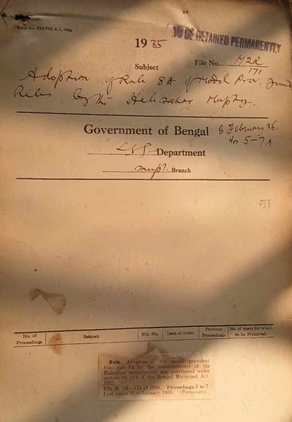 | Rack No. 12, Bundle No. 03 Sl No. 148 Submission of application for Pension on Proceeding on leave preparatory to retirement. | Rack No. 12, Bundle No. 03 Sl No. 149 L.A. by the Calcutta Improvement Trust for Improvement Scheme No. XL (Road Connection Chittaranjan Avenue with wellington Street). | Rack No. 12, Bundle No. 03 Sl No. 150 Payment of gratuity to the orderly Khudikheikh by the Rajshahi Municipality | Rack No. 12, Bundle No. 03 Sl No. 151 Calcutta Improvement Trust. | Rack No. 12, Bundle No. 03 Sl No. 152 Adoption of Rule 8A of Model Provident fund Rules, by the Halishar Municipality. | Rack No. 12, Bundle No. 03 Sl No. 153 Contribution of Rs. 25 to the British Empire Leprosy Association by the Basirhat Municipality for 1933-34. | Rack No. 12, Bundle No. 03 Sl No. 154 Adoption of model by laws regarding Prohibition and regulation of traffic by the south suburban Municipality. |