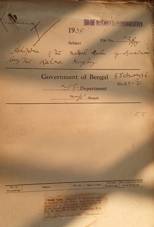 | Rack No. 12, Bundle No. 03 Sl No. 152 Adoption of Rule 8A of Model Provident fund Rules, by the Halishar Municipality. | Rack No. 12, Bundle No. 03 Sl No. 153 Contribution of Rs. 25 to the British Empire Leprosy Association by the Basirhat Municipality for 1933-34. | Rack No. 12, Bundle No. 03 Sl No. 154 Adoption of model by laws regarding Prohibition and regulation of traffic by the south suburban Municipality. | Rack No. 12, Bundle No. 03 Sl No. 155 Adoption of the model Rule of business by the Kalna Municipality. | Rack No. 12, Bundle No. 03 Sl No. 156 Kandi Municipal address to Honorable Minister. | Rack No. 12, Bundle No. 03 Sl No. 157 C.Q. by the Ananda Mohan Poddar regarding the Narayanganj Municipality. | Rack No. 12, Bundle No. 03 Sl No. 158 Compassionate pension to Mr. Herbert Durrant, late fireman of the Calcutta fire Bridge. |