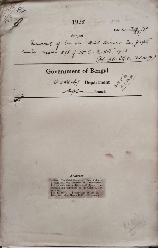 | Rack No. 12, Bundle No. 11, Sl No. 747 Temporary advance of Rs. 12,781 for lying of S.W. Pipe Sewer in Palm Avenue in ward no. 27. | Rack No. 12, Bundle No. 11, Sl No. 748 L.A. by the Howrah Municipality for diversion of the Kazir Para Lane. | Rack No. 12, Bundle No. 11, Sl No. 749 Levy of terminal tax under the Govt. of India Act, 1935. | Rack No. 12, Bundle No. 11, Sl No. 750 Removal of ban on Anil Kumar Sen Gupta | Rack No. 12, Bundle No. 11, Sl No. 751 Section 54A of the C.M. Act 1933. | Rack No. 12, Bundle No. 11, Sl No. 752 Amendments to the fundamental and Subsidiary Rules under Section 241 of Govt. of India Act, 1935. | Rack No. 12, Bundle No. 11, Sl No. 753 Transfer of a Piece of land comprising the road and its side slopes on the south of the College Compound at Chittagong. |
