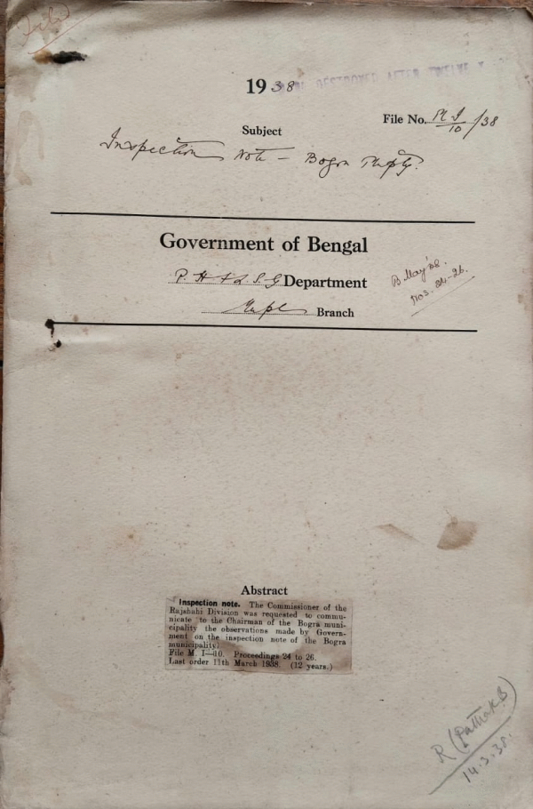 | Rack No. 12, Bundle No. 11, Sl No. 753 Transfer of a Piece of land comprising the road and its side slopes on the south of the College Compound at Chittagong. | Rack No. 12, Bundle No. 11, Sl No. 754 Loan of Rs. 20,000/- for improvement of Roads, Jessore Municipality. | Rack No. 12, Bundle No. 11, Sl No. 755 L.A. by the Kushtia Municipality for a burial ground in the village of Chourbans. | Rack No. 12, Bundle No. 11, Sl No. 756 Proposal for lighting the Panihat Municipality in the 24 parganas district with electricity. | Rack No. 12, Bundle No. 11, Sl No. 757 Inspection Note-Bogra Municipality. | Rack No. 12, Bundle No. 11, Sl No. 758 Assessment of the properties of the port commissioner by the Howrah Municipality. | Rack No. 12, Bundle No. 11, Sl No. 759 L.A. by the Khulna Municipality for extension of Mirzapur Road. |