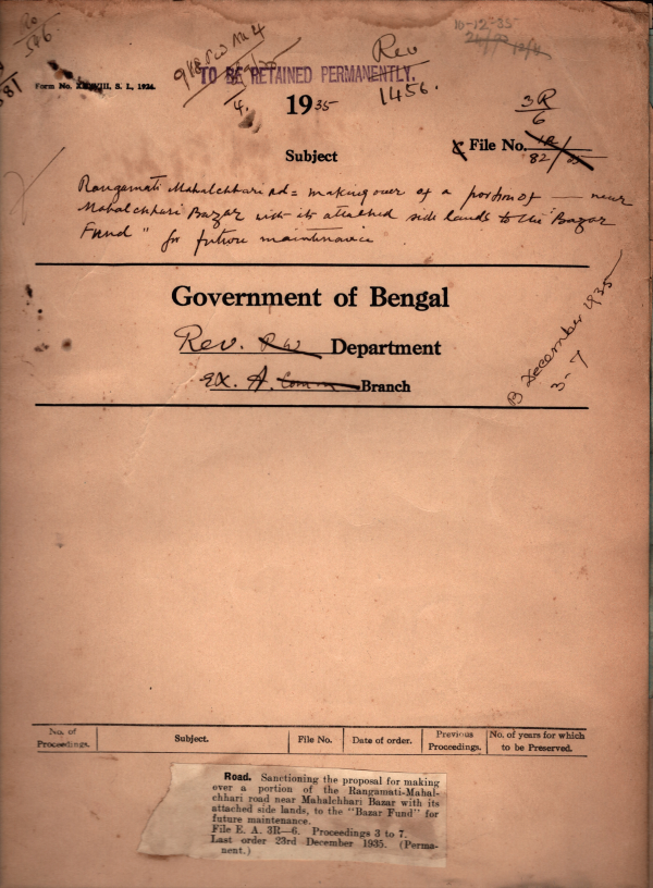 Sanctioning the proposal for making over a portion of the Rangamati Mahol Chhari road near Mahalakhari Bazar with its attached side lands to the Bazar Fund. for future maintenance.