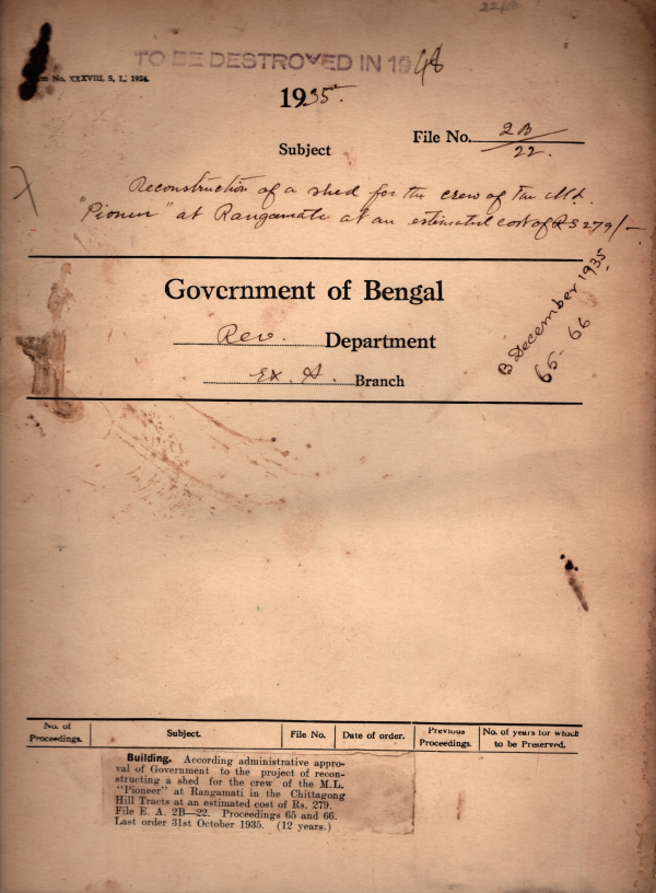 Reconstruction of a shed for the crew of the Md. Pionur at Rangamati at an estimated cost of Rs. 279.