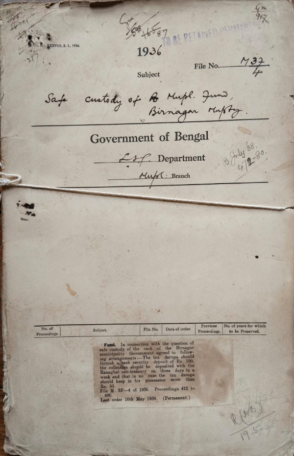 | Rack No. 12, Bundle No. 11, Sl No. 758 Assessment of the properties of the port commissioner by the Howrah Municipality. | Rack No. 12, Bundle No. 11, Sl No. 759 L.A. by the Khulna Municipality for extension of Mirzapur Road. | Rack No. 12, Bundle No. 11, Sl No. 760 Reconstitution Dainhat Municipality. | Rack No. 12, Bundle No. 12, Sl No. 761 Safe Custody of Municipal fund Birnagar Municipality. | Rack No. 12, Bundle No. 12, Sl No. 762 Adoption of the new P.F. Rule 5 by the Jessore Municipality. | Rack No. 12, Bundle No. 12, Sl No. 763 Notes of Audit of the Account of the Midnapur Municipality for 1935-36. | Rack No. 12, Bundle No. 12, Sl No. 764 Adoption of Bye-laws by The Dacca Municipality. |