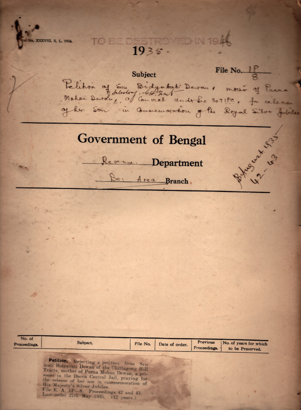 Rejecting a petition from Srimati Bidyavati Dewan of the Chittagong Hill Tracts, mother of Puran Mohan Dewan, a prisoner in the Dacca Central Jail praying for the relax of her son in commutation of His Majesty's Silver Jubilee.