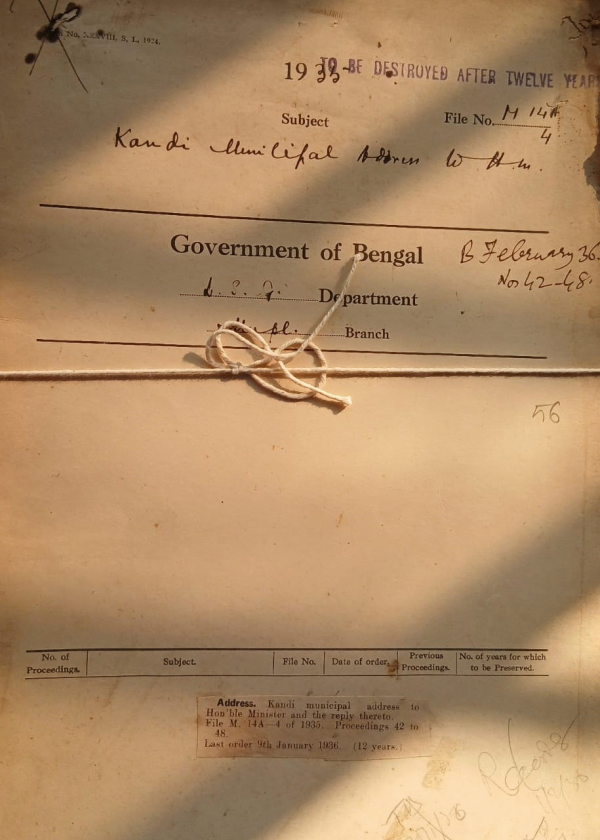 | Rack No. 12, Bundle No. 03 Sl No. 153 Contribution of Rs. 25 to the British Empire Leprosy Association by the Basirhat Municipality for 1933-34. | Rack No. 12, Bundle No. 03 Sl No. 154 Adoption of model by laws regarding Prohibition and regulation of traffic by the south suburban Municipality. | Rack No. 12, Bundle No. 03 Sl No. 155 Adoption of the model Rule of business by the Kalna Municipality. | Rack No. 12, Bundle No. 03 Sl No. 156 Kandi Municipal address to Honorable Minister. | Rack No. 12, Bundle No. 03 Sl No. 157 C.Q. by the Ananda Mohan Poddar regarding the Narayanganj Municipality. | Rack No. 12, Bundle No. 03 Sl No. 158 Compassionate pension to Mr. Herbert Durrant, late fireman of the Calcutta fire Bridge. | Rack No. 12, Bundle No. 03 Sl No. 159 Election of Chairman, Vishnupur Municipality. |