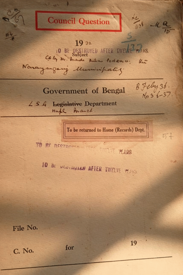 | Rack No. 12, Bundle No. 03 Sl No. 154 Adoption of model by laws regarding Prohibition and regulation of traffic by the south suburban Municipality. | Rack No. 12, Bundle No. 03 Sl No. 155 Adoption of the model Rule of business by the Kalna Municipality. | Rack No. 12, Bundle No. 03 Sl No. 156 Kandi Municipal address to Honorable Minister. | Rack No. 12, Bundle No. 03 Sl No. 157 C.Q. by the Ananda Mohan Poddar regarding the Narayanganj Municipality. | Rack No. 12, Bundle No. 03 Sl No. 158 Compassionate pension to Mr. Herbert Durrant, late fireman of the Calcutta fire Bridge. | Rack No. 12, Bundle No. 03 Sl No. 159 Election of Chairman, Vishnupur Municipality. | Rack No. 12, Bundle No. 03 Sl No. 160 Enquiry as to the Conditions attached to the grant of Rs. 1000/- paid to Mymensingh Municipality. |